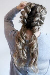 - Treccia incatenata (Pull through Braid): Una treccia che non è una treccia! Ogni ciocca viene fermata con un elastico e l’effetto finale risulta molto simile ad una treccia molto grossa e voluminosa. Ideale per chi ha capelli fini!